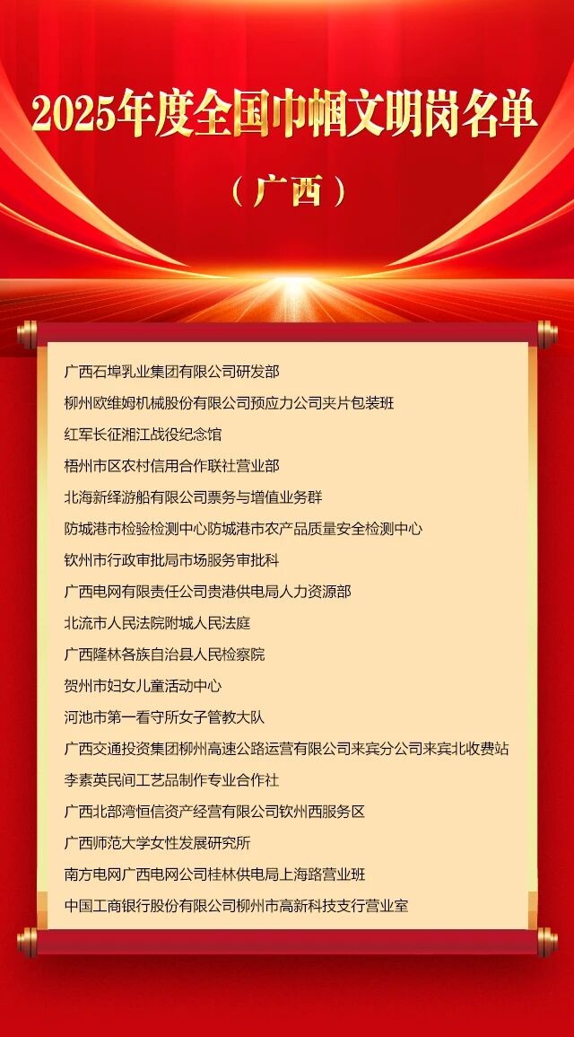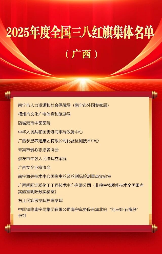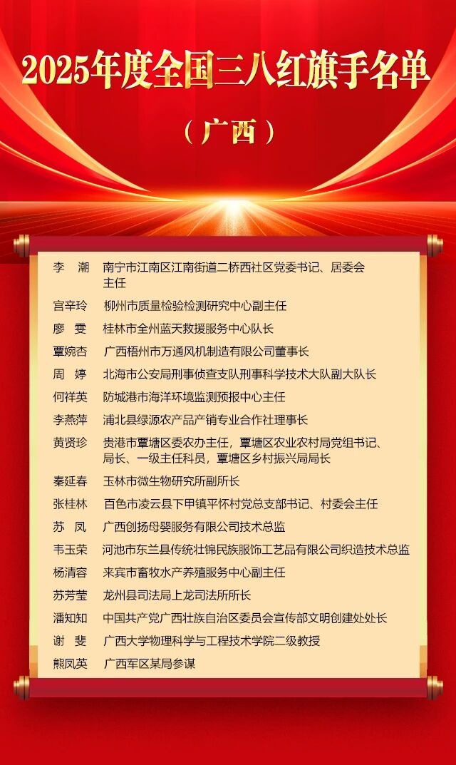 3月2日,全國婦聯在京舉行紀念“三八”國際婦女節暨表彰大會。大會表彰了9名全國三八紅旗手標兵、598名全國三八紅旗手、400個全國三八紅旗集體、600個全國巾幗文明崗。我區共有18名個人和30個單位上榜。 廣西獲獎個人和集體當中,祝雪蘭榮獲2025年度全國三八紅旗手標兵;李潮、宮辛玲、廖雯等17人被授予全國三八紅旗手稱號;南寧市人力資源和社會保障局等12個集體被授予全國三八紅旗集體稱號;廣西石埠乳業集團有限公司研發部等18個集體被授予全國巾幗文明崗稱號。