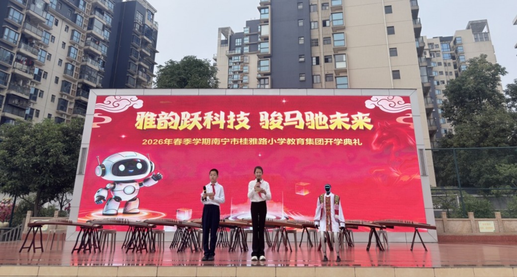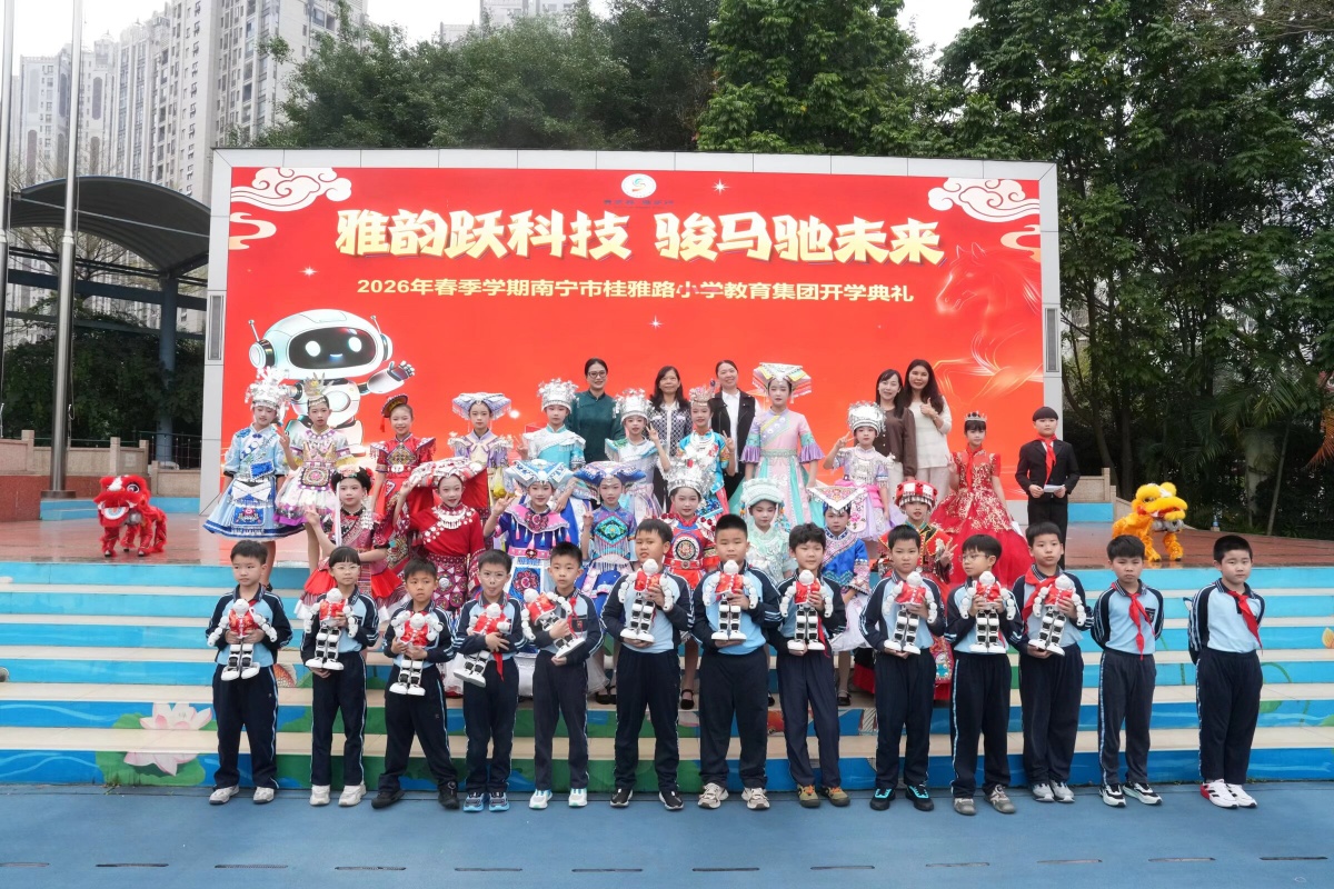 2026年3月2日上午,南寧市桂雅路小學桂雅、桂花兩校區同步舉行春季學期開學典禮,以“雅韻躍科技,駿馬馳未來”為主題,融合科創實踐與傳統文化,厚植科技強國理念,厚筑文化自信根基。