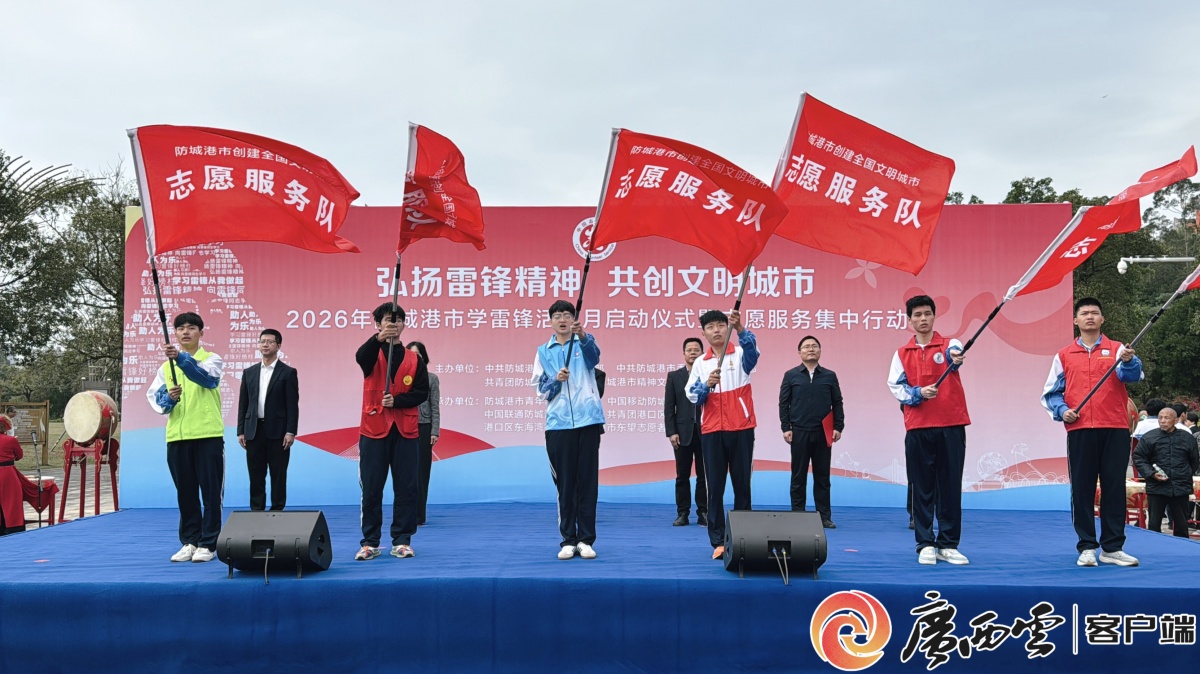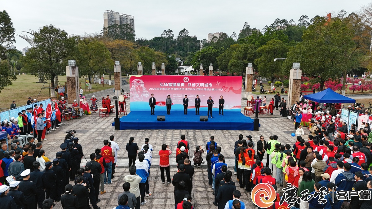 2026年防城港市“學雷鋒活動月”啟動儀式現場。視頻攝制:記者 楊康 3月5日,在第63個“學雷鋒紀念日”、第6個“廣西志愿者日”到來之際,2026年防城港市學雷鋒活動月啟動儀式暨志愿服務集中行動在該市白鷺公園舉行。活動以“弘揚雷鋒精神 共創文明城市”為主題,將學雷鋒志愿服務與全國文明城市創建深度融合、一體推進,以志愿紅點亮文明城,以雷鋒精神凝聚創城合力,奏響港城文明建設新樂章。