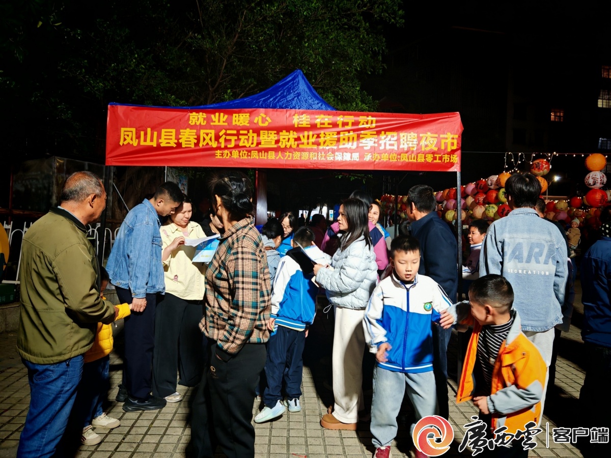 鳳山縣開展春風行動暨就業援助季招聘夜市活動。 今年以來,鳳山縣將就業服務深度融入城市“夜經濟”,創新推出夜間逛崗、企業擺攤、直播帶崗三位一體服務模式,把崗位送到群眾身邊、把服務做到群眾心坎,以煙火氣托起就業夢,持續提升就業服務質效,不斷增強群眾就業獲得感。 精準挖崗,架起供需“連心橋”。鳳山縣建立人社服務專員聯系企業制度,依托“廣西就業”平臺動態監測用工需求,組建10支用工服務隊深入園區企業、鄉鎮企業訪企問需。通過零工市場公眾號線上掃碼和實地走訪等渠道,精準歸集農產品加工、服飾紡織等8個行業1000余個優質崗位,實現企業需求與群眾就業精準匹配。