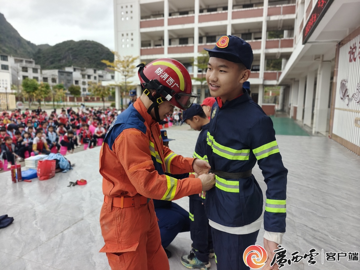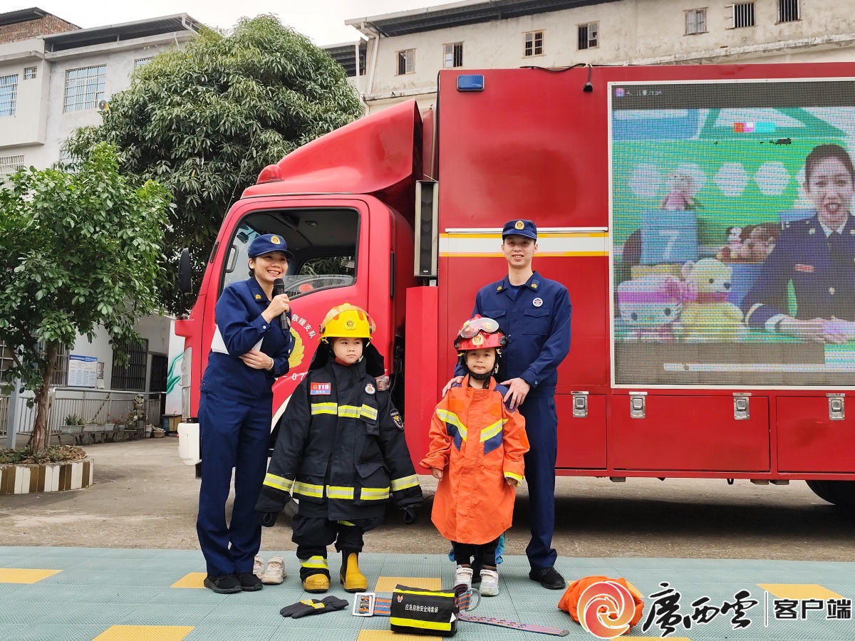 穿戴專業消防裝備。 趣味互動加持,安全知識入腦入心。玉林、百色等地還將消防車輛搬進校園,帶領同學們近距離參觀消防車,細致講解各類裝備的功能用途;同時,設置消防服體驗環節,讓大家穿戴專業消防裝備,親身感受消防員執勤救援的艱辛,直觀體會消防安全的重要意義,現場互動氛圍熱烈。 開學季期間,全區各地消防部門將持續推進消防宣傳“進學校”活動常態化,通過擔任校外輔導員、定期組織演練等方式,將消防安全意識融入師生日常,全力守護校園平安。 (本文圖片均由廣西消防救援總隊 提供) |