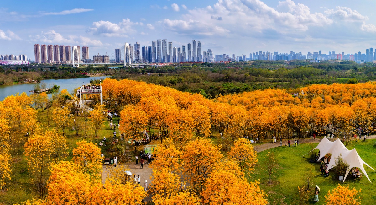 3月1日,南寧青秀山風景區內近萬株黃花風鈴木花海盛開。廣西云-廣西日報記者 周軍 同程旅行的數據也印證了春假對旅游市場的帶動作用——近一周,平臺上,3月31日至4月6日出發的機票搜索量及預訂熱度顯著上漲,環比上一周上漲約2倍。其中,關注度較高的國內游目的地主要有三亞、成都、昆明、廣州、林芝等;出境游熱門目的地主要有中國香港、中國澳門、曼谷、清邁、新加坡等。熱門出發地主要有江蘇、上海、四川、浙江等。