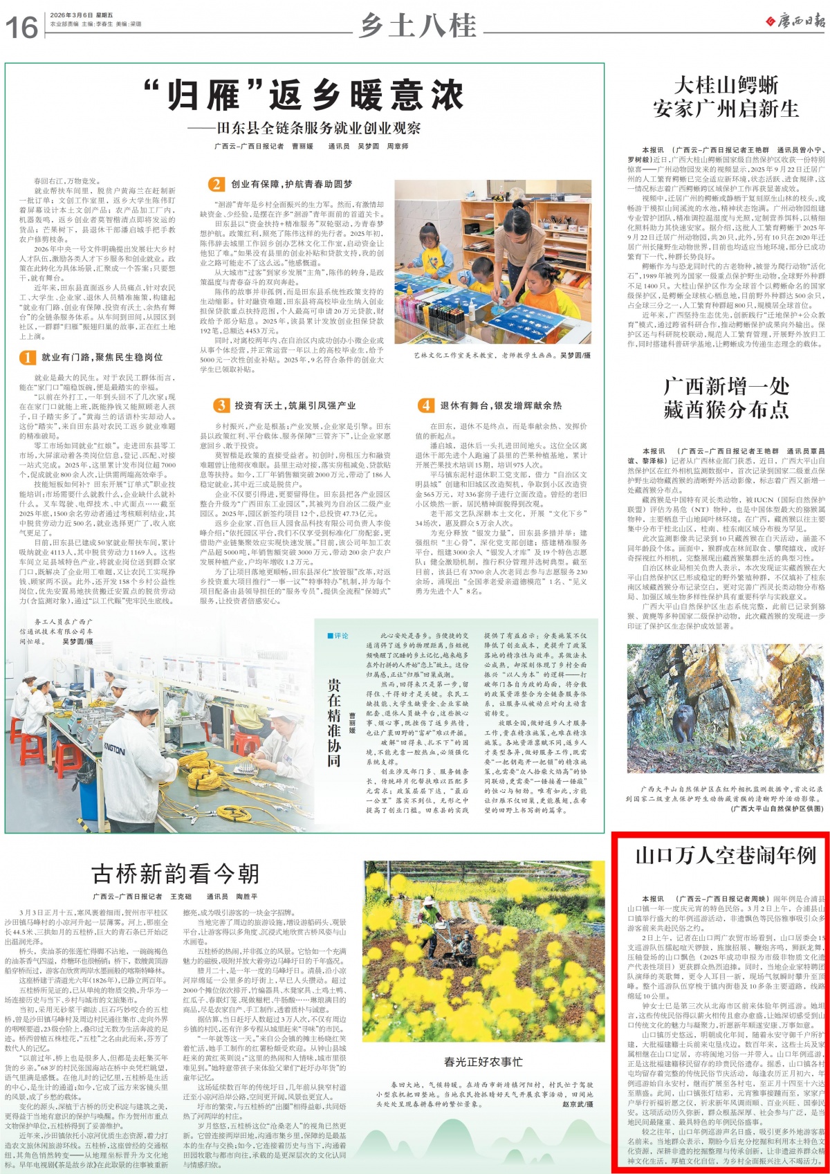 舞龍巡游。 較之往年,山口年例巡游聲名日盛,吸引更多外地游客慕名前來。當(dāng)?shù)厝罕姳硎荆谂谓窈蟪浞滞诰蚝屠帽就撂厣幕Y源,深耕非遺的挖掘整理與傳承創(chuàng)新,讓非遺滋養(yǎng)群眾精神文化生活,厚植文化自信,為鄉(xiāng)村全面振興注入不竭活力。 2026年3月6日廣西日報16版截圖 點擊閱讀原文