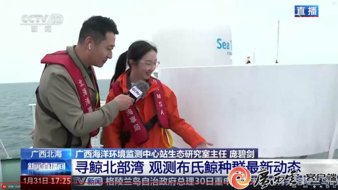 龐碧劍(左二)在對(duì)布氏鯨種群與棲息地調(diào)查的魚(yú)獲進(jìn)行分類(lèi)鑒定。 “各位觀眾,大家好!現(xiàn)在我們看到的是布氏鯨比較喜歡吃的魚(yú)......”1月30日至2月1日,廣西海洋環(huán)境監(jiān)測(cè)中心站聯(lián)合中央廣播電視總臺(tái)廣西總站,組織策劃了《尋鯨北部灣——北部灣布氏鯨科考直播》活動(dòng)。龐碧劍在央視新聞直播間里向全國(guó)觀眾、網(wǎng)友科普了布氏鯨保護(hù)知識(shí),直播分別在央視新媒體和央視新聞CCTV13同步直播,近2000萬(wàn)人觀看了此次直播,充分展現(xiàn)了北部灣生態(tài)之美和海洋生態(tài)環(huán)境保護(hù)成效,讓海洋生態(tài)保護(hù)理念深入人心。